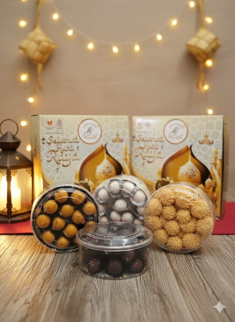 Hampers kue kering premium spesial Hari Raya, tampil elegan dengan kemasan eksklusif, cocok untuk hadiah keluarga, relasi, maupun bingkisan usaha.